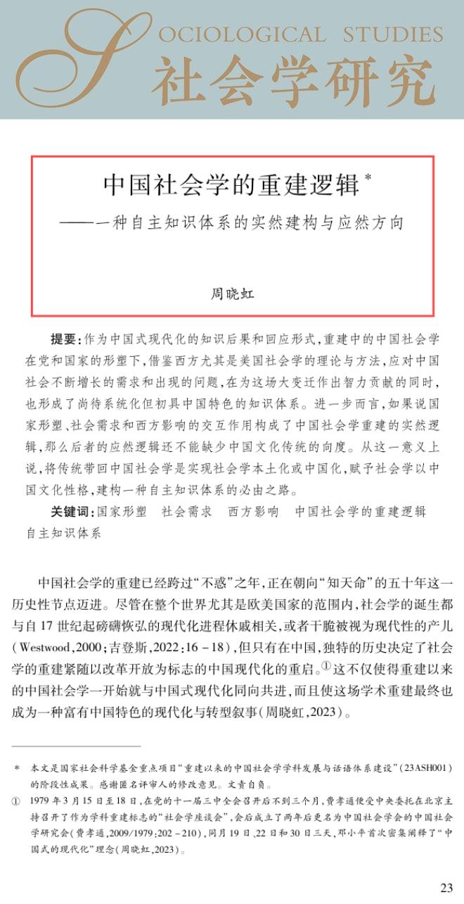 周晓虹教授在《社会学研究》发文,中国社会学的重建逻辑——一种自主知识体系的实然建构与应然方向2025.11 -
