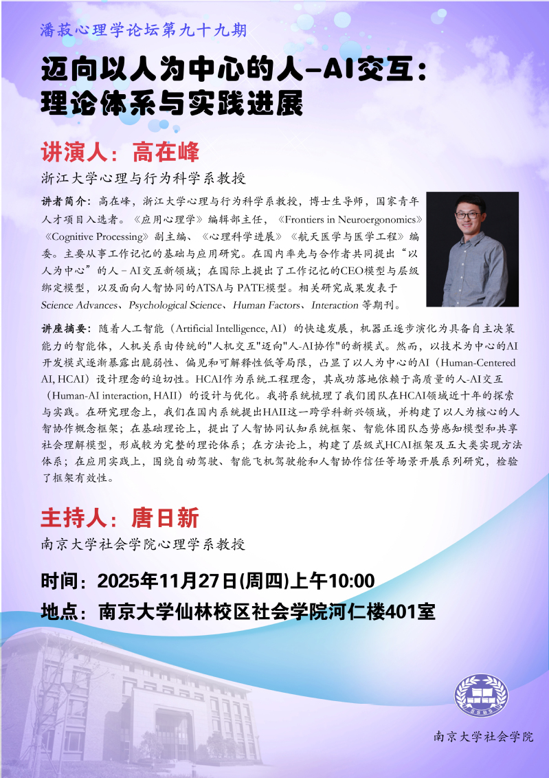 讲座 | 潘菽心理学论坛第九十九期2025.11 -