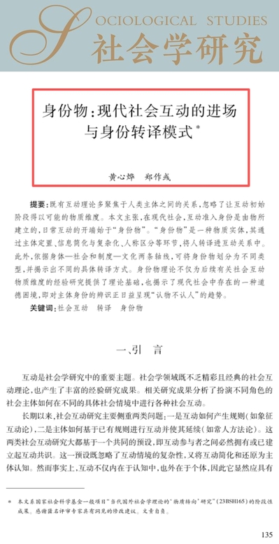 黄心烨同学、郑作彧教授在《社会学研究》发文,身份物:现代社会互动的进场与身份转译模式2025.11 -