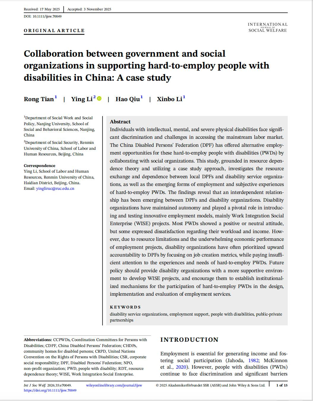 新论 | 田蓉副教授在 International Journal of Social Welfare 上发表研究论文2025.11 -