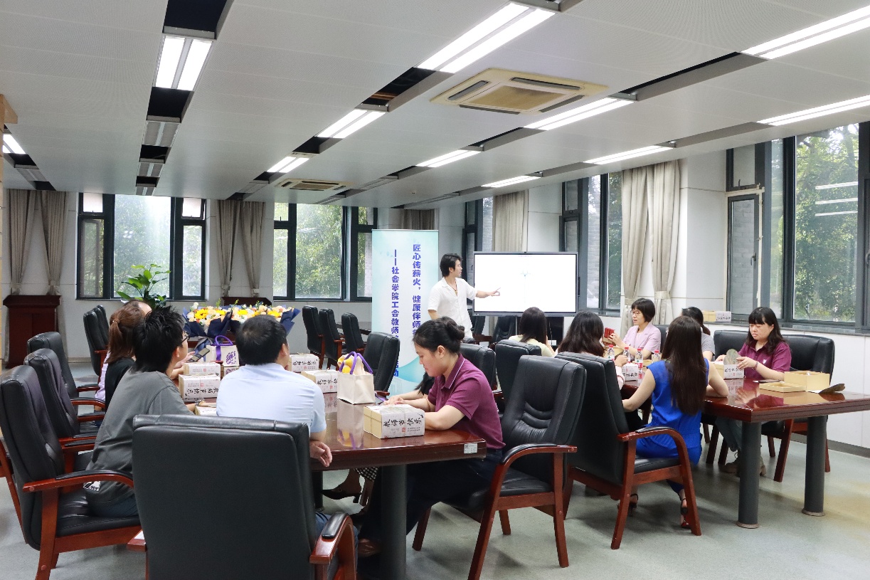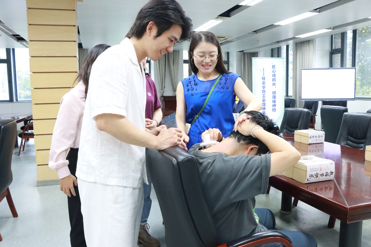 活动围绕“健康关怀、新老教师结对、茶话互动”三大核心环节展开,内容丰富且贴近教师需求。在健康关怀环节,工会特邀专业人士开展“教师颈肩养护”与“办公族高效放松”主题讲座,30分钟的分享既讲解了实用经络养护知识,又开放互动答疑,帮助教师缓解职业健康困扰;讲座后设置的按摩仪试用、体验区,更让教师们在实操中放松身心,收获满满。