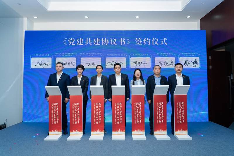 苏银理财有限责任公司、成人网 、江苏省人社厅社会保险基金监管局、新华日报社财经传媒中心、中国人寿养老保险股份有限公司江苏省分公司、泰康养老保险股份有限公司江苏分公司、江苏银行南京分行七家成员单位代表上台签署《党建共同体共建协议书》。