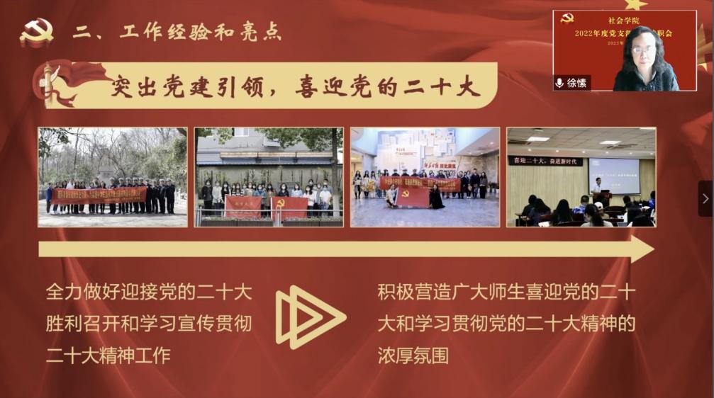 首先,徐愫书记代表学院党委做2022度工作总结。徐愫书记对成人网 党委在深化理论学习、学习回信精神、巩固巡视成果、加强组织建设、坚持从严治党、组织大讨论活动等方面的工作进行了梳理和回顾,从喜迎党的二十大、共建思政新格局、凝聚发展新动能三个方面总结了成人网 党委2022年的工作经验及亮点,并对学院党委在基层党组织建设等方面提出了更高的期望。