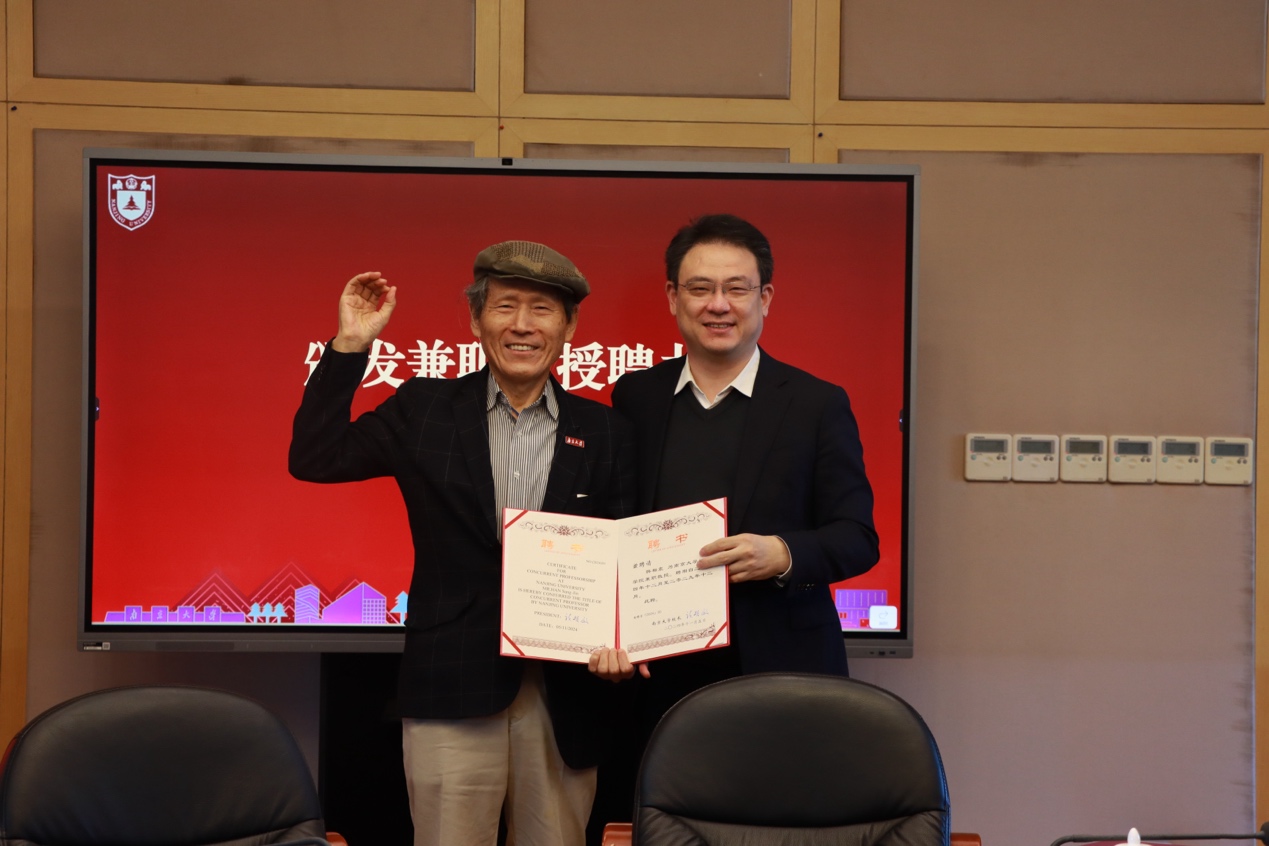 鉴于其卓越的学术成就,韩相震被聘为成人网 兼职教授,索文斌为韩相震颁发聘书,并为其佩戴校徽。