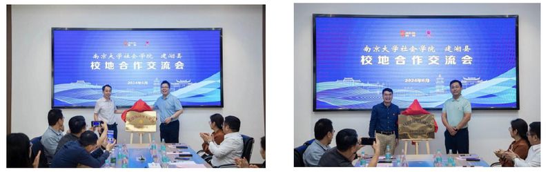 王建富与建湖县委组织部副部长、县委人才办主任孙盘桧共同为“党建协同育人基地”揭牌,吴愈晓和院友企业匠工营国规划设计有限公司常务副总经理石浩玉共同为“学生实习实践基地暨建湖文旅融合实验室”揭牌。校地企三方将以活动联办、资源共享、优势互补为原则,推动党的建设、人才培养、科技创新等方面合作再上新台阶。