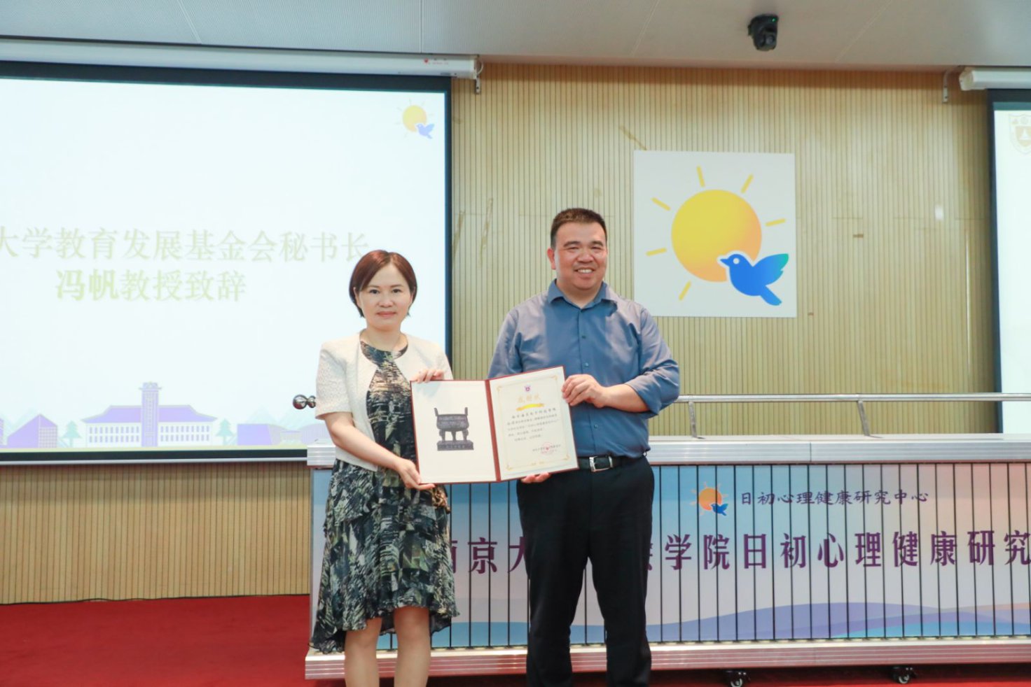 成人网 教育发展基金会秘书长冯帆教授代表基金会致辞,并为南京海灵电子科技有限公司颁发感谢状。“日初”象征破晓的希望,体现了校企合作、科技赋能社会的共同愿景。她表示,学校教育发展基金会将严格规范地管理使用捐赠资金,保障每一份善意都发挥最大价值。她期待日初心理健康研究中心成为人才培养的“立交桥”、心理服务的“示范点”、公益品牌的“引领者”。