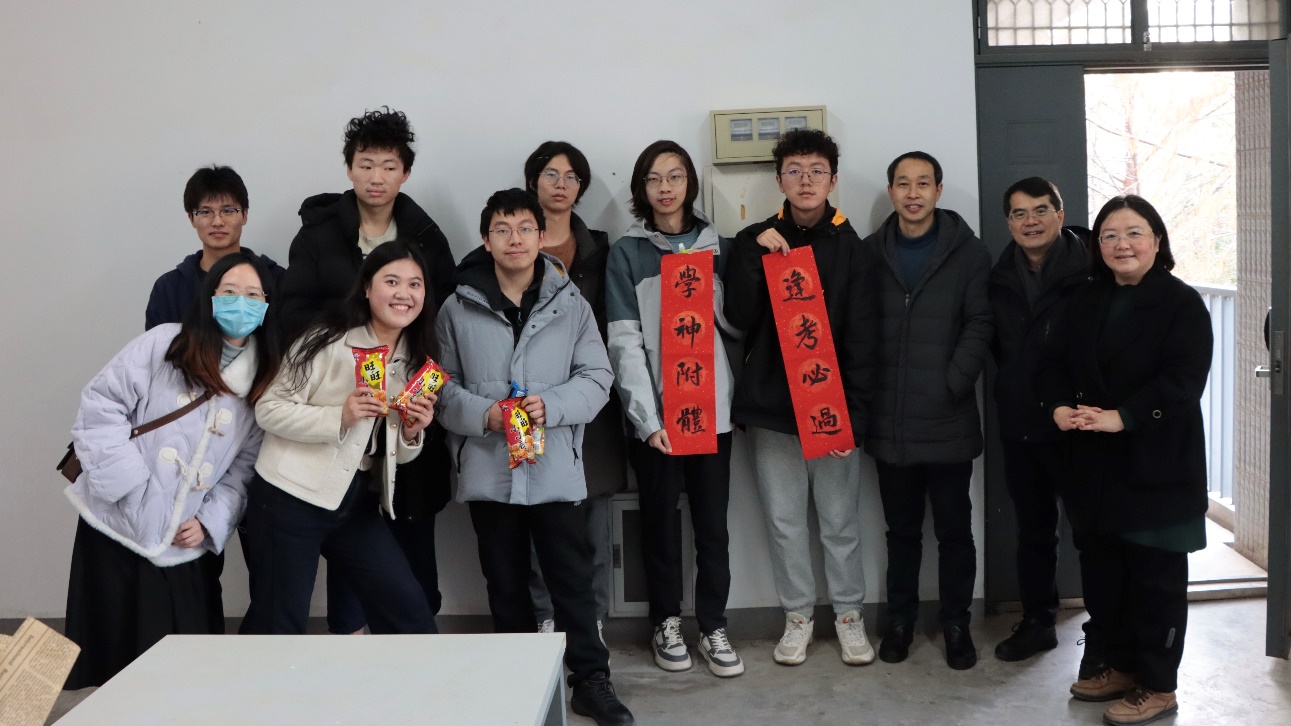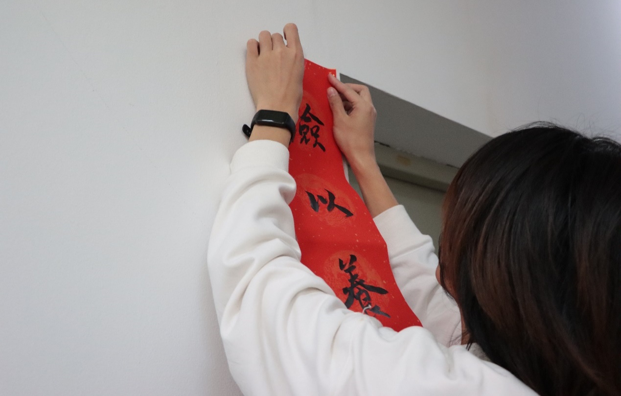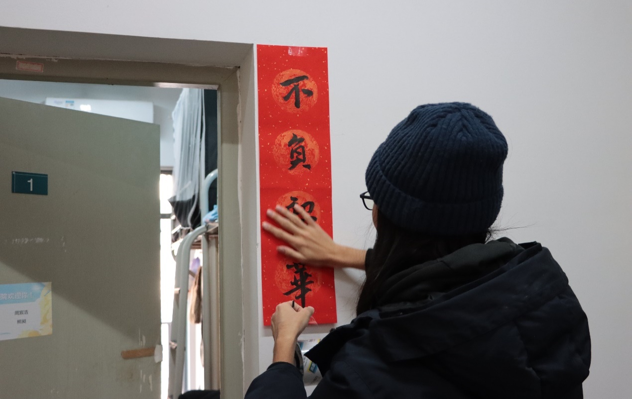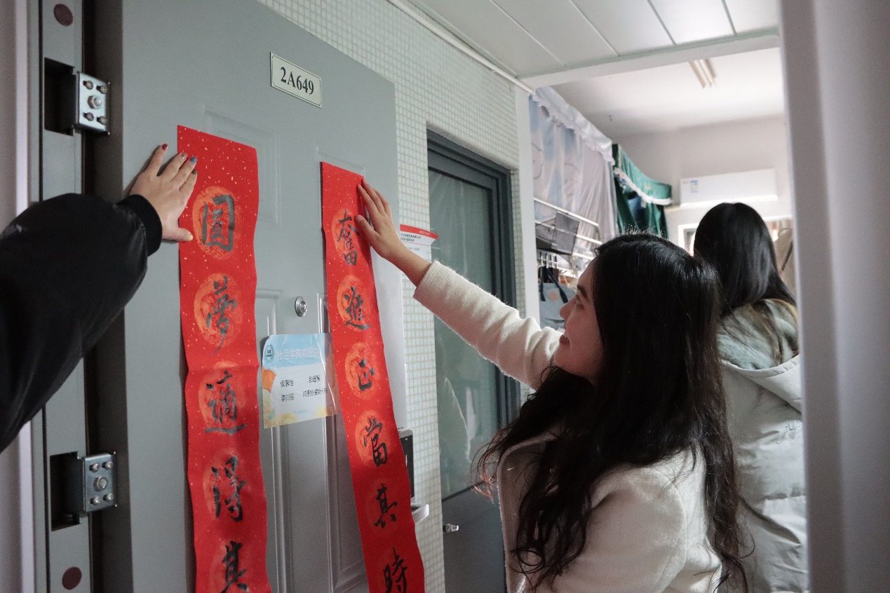 临近春节,本科生辅导员刘艺亲笔为同学们书写了春联,从“学神附体,逢考必过”的祝福,到“静以修身,俭以养德”的期许,再从“只争朝夕,不负韶华”的叮嘱,到“奋进正当其时,圆梦适得其势”的共勉……为大家送去了最真诚的加油和鼓励。同学们欣喜之余,立马表示要在寝室把春联张贴起来,现场一片其乐融融。