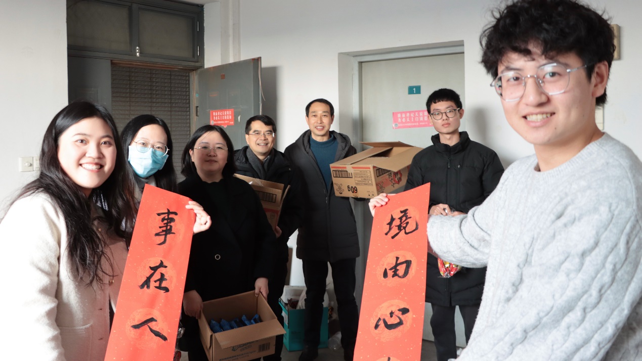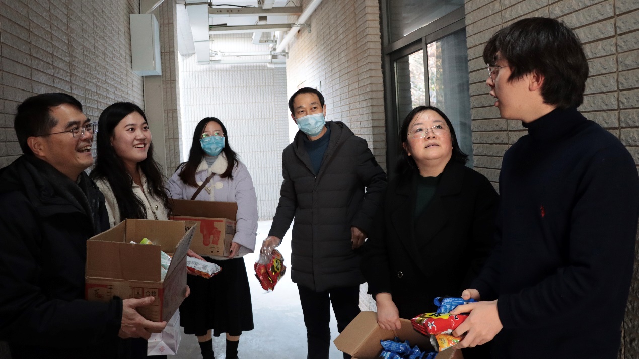 从学生中来,到学生中去。为加强师生联系,关心学生学习生活,成人网 党委书记王建富、党委副书记沈晖、副院长吴愈晓、本科生辅导员刘艺、研究生辅导员邵晓宁于1月5日下午走进仙林校区本科生宿舍,为同学们送上了贴心的备考礼包和暖心的祝福。