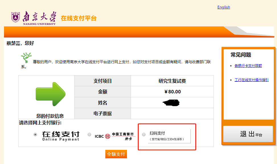 4、因第三方支付平台系统维护, “银联在线支付”功能暂时关闭,即无法通过银行网银转账支付,务必选择“扫码支付”(微信、支付宝扫码支付功能可正常使用)完成缴费。